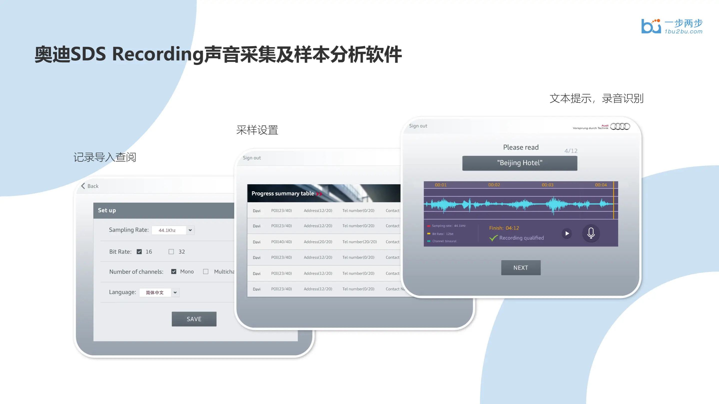一步两步为奥迪中国开发了Audi-O iPad工具程序,用于奥迪公司针对车载语音进行用户数据采集。管理员负责制定志愿者名单和他们需要回答的问题,每个志愿者根据管理员的指示,使用iPad外接的语音输入设备录入自己的回答,由程序生成语音文件。管理员在收集好素材后,能够使用导出工具将iPad中的语音文件导出预设的格式。