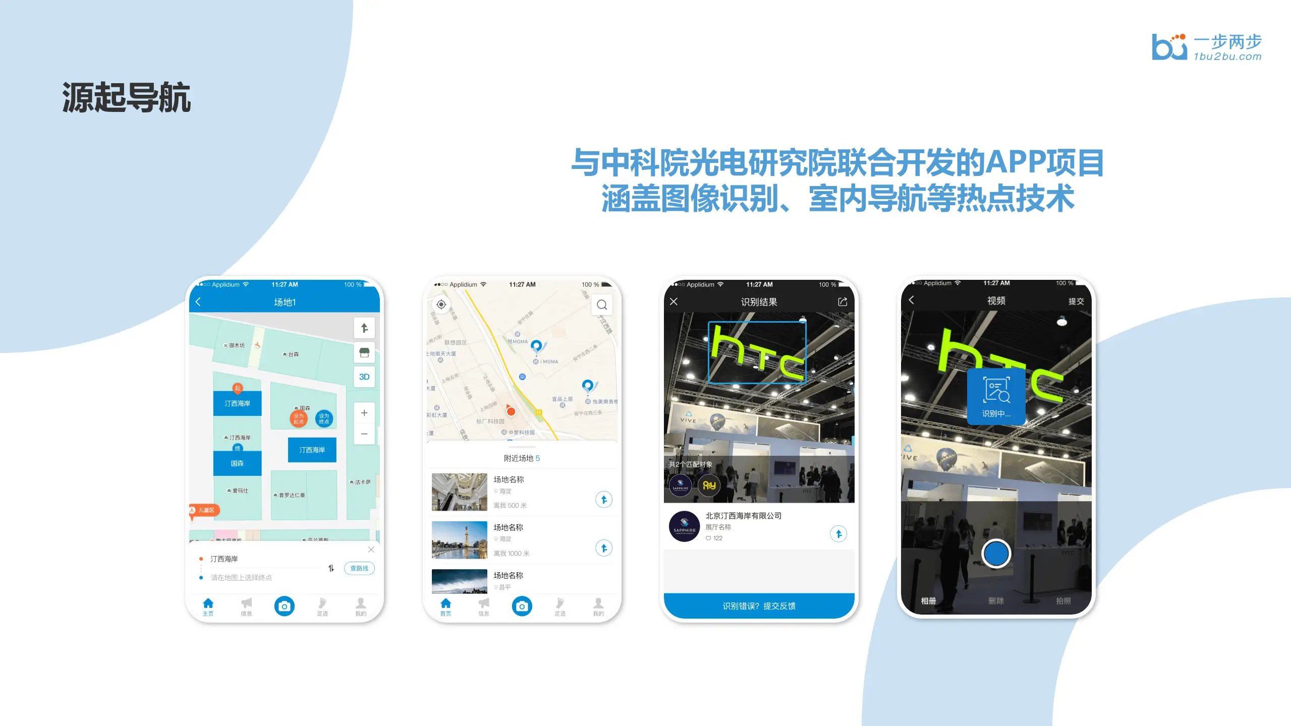 北京一步两步科技有限公司与中科院光电研究院联合开发的"源起导航"APP最近顺利上线了。"源起导航"系统的核心功能是通过图像深度学习绑定展会地图的POI点, 并通过图像识别算法来搭建参展供应商以及展会参观者的应用场景。图像识别、室内导航是当前的技术热点,我们从此会致力于积累更多这方面的经验和技术能力。