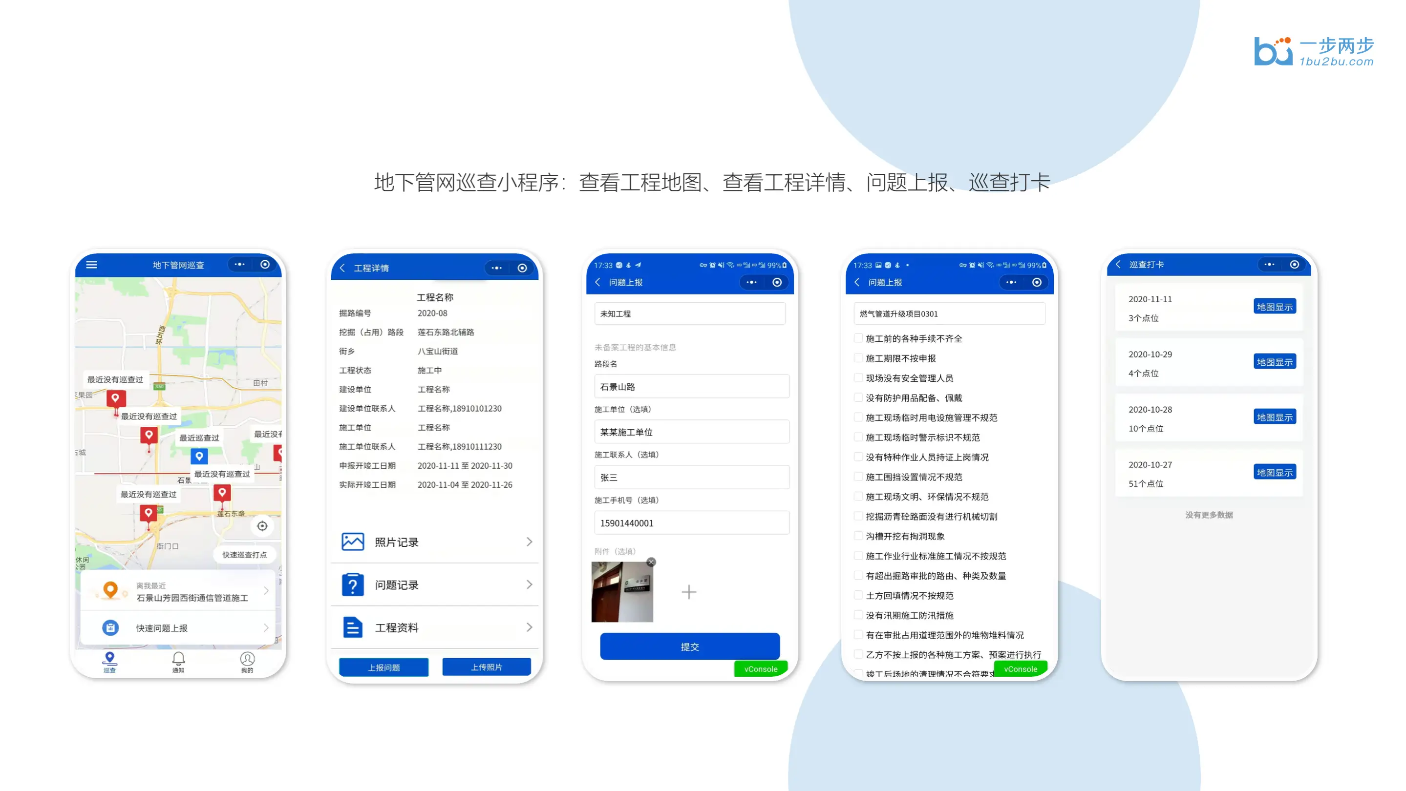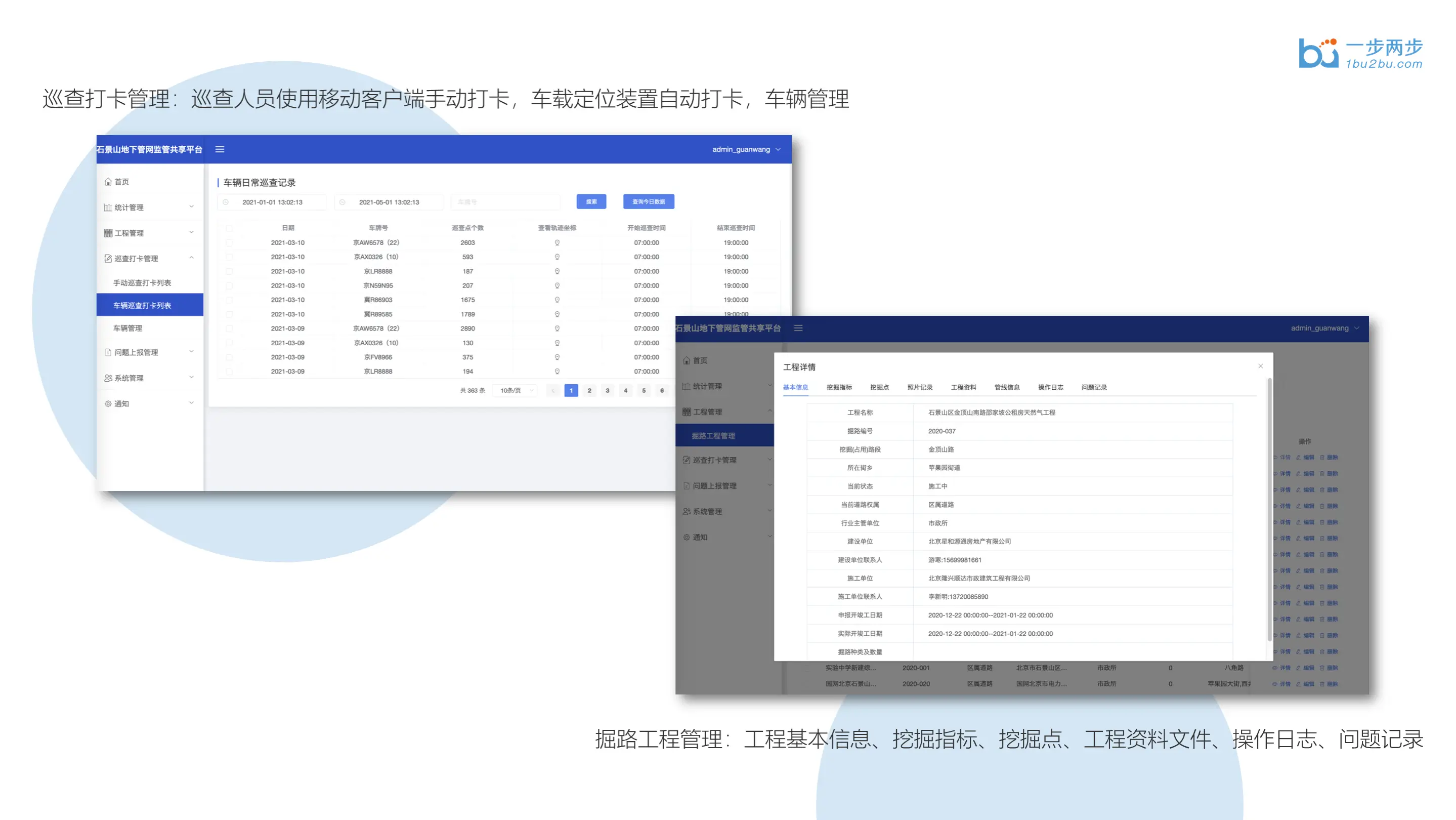 一步两步为石景山区城管委开发的《城市地下管线管理平台》,建设目标是以城市地下管线巡查与监管为中心,形成规划备案单位、行业主管单位、管线权属单位等机构之间多级管理网络,分阶段、分区域、分内容建立多层次的、实用的、与城市建设管理系统业务紧密关联的信息共享平台系统。
