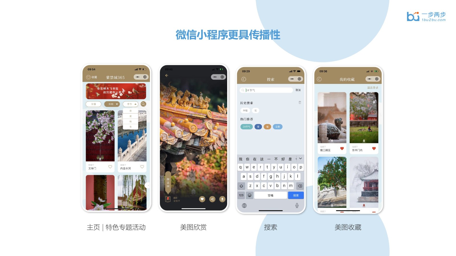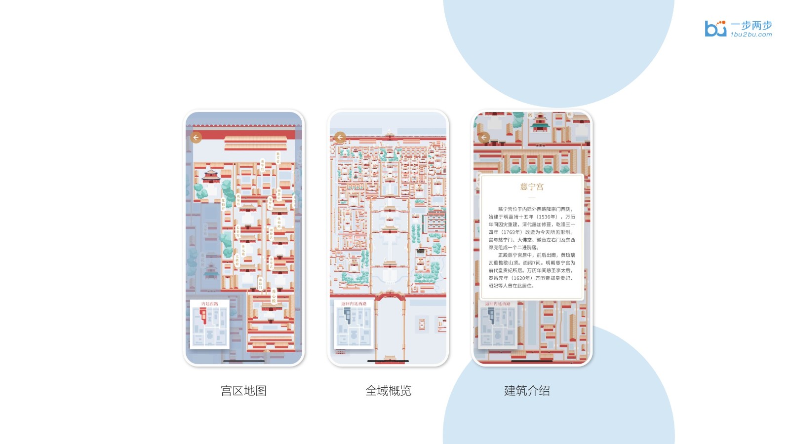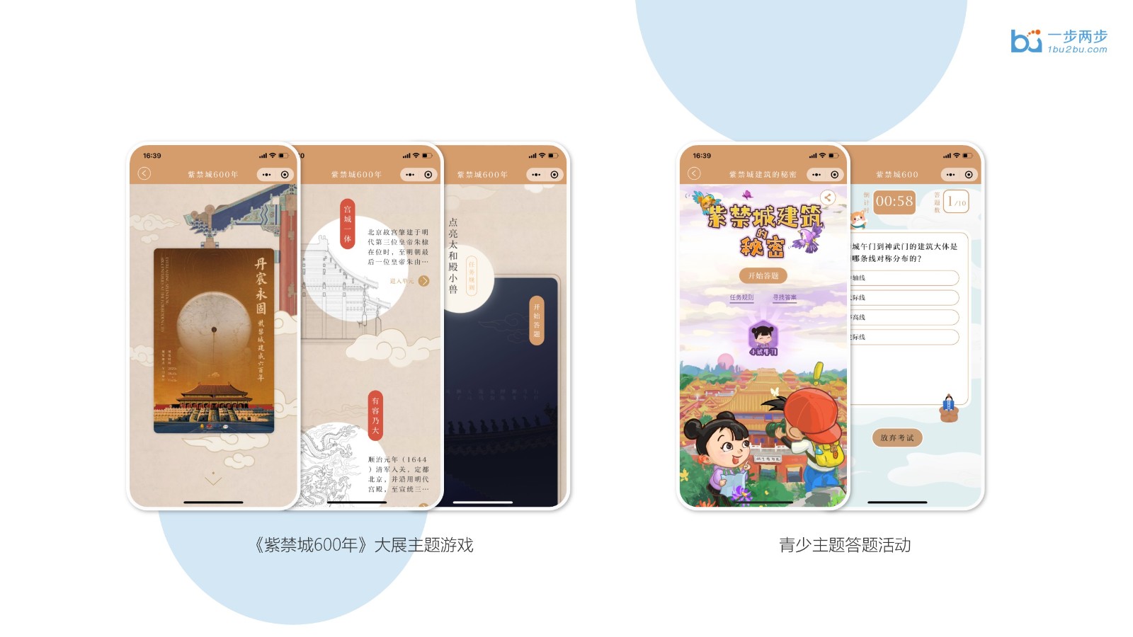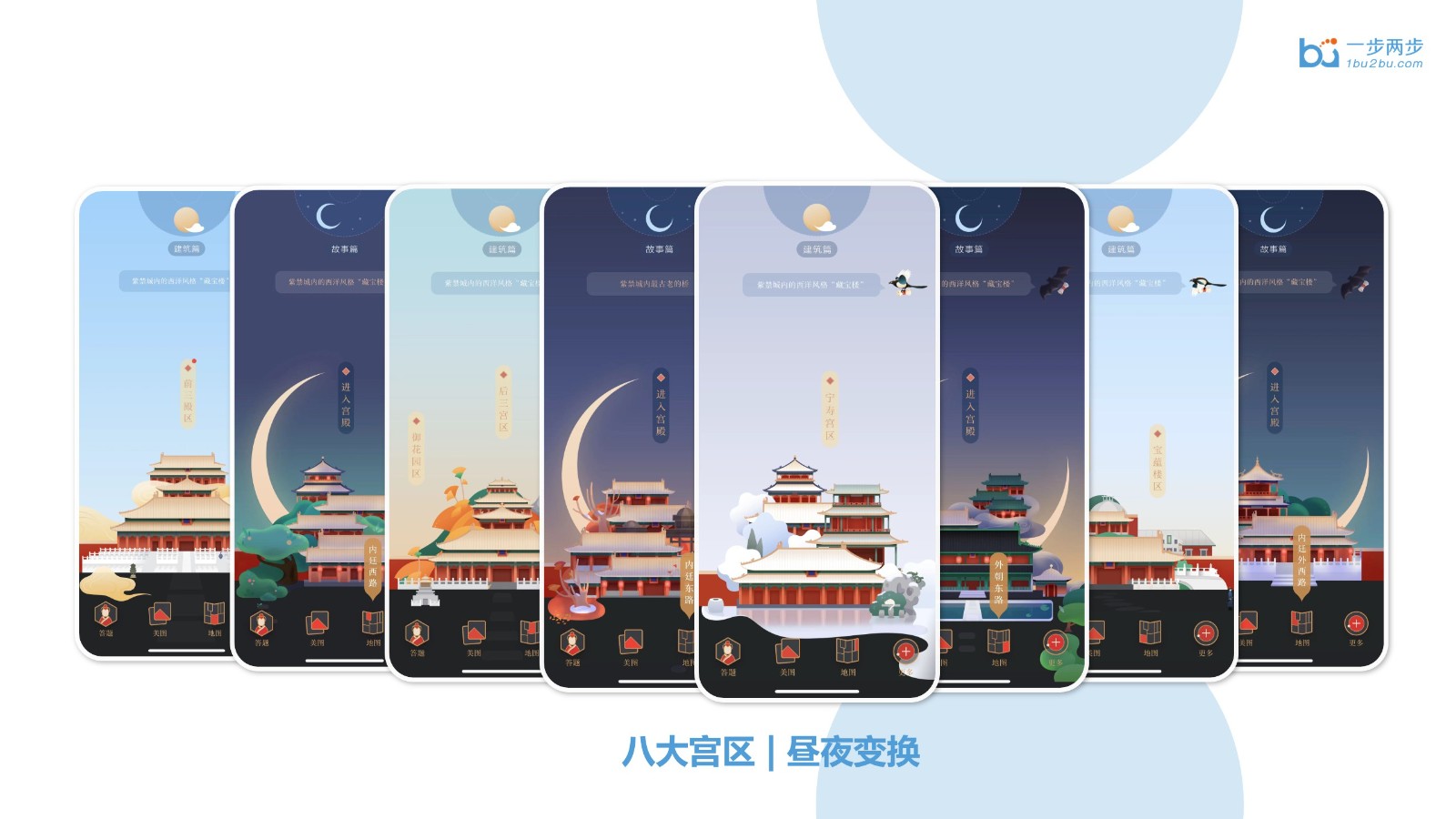 一步两步为故宫博物院开发的《紫禁城365》app及小程序,是以紫禁城建筑知识为主题的文化教育移动互联网产品。《紫禁城365》以生动的UI界面、和富于游戏化的互动环节,让用户深入了解关于故宫建筑的全方面知识,真正做到了寓教于乐。
