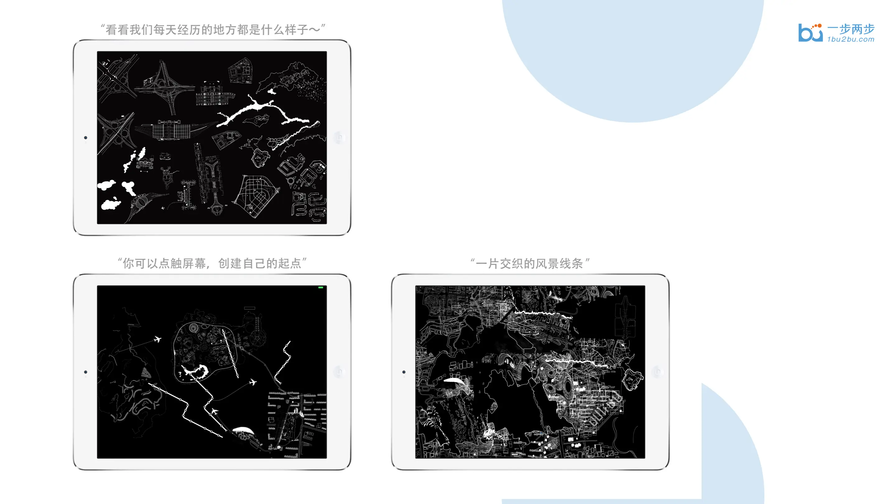 《快捷风景》是一步两步为中央美院张文超硕士开发的一款交互iPad应用。程序根据作者的逻辑要求,不断生长出俯视的地形图和各种交通工具的路径,形成一个错综复杂的、自我衍生的地图体系。在展厅展览时,程序连接大屏幕,观众可以随时打断自动运行,在点触位置形成新的起点。