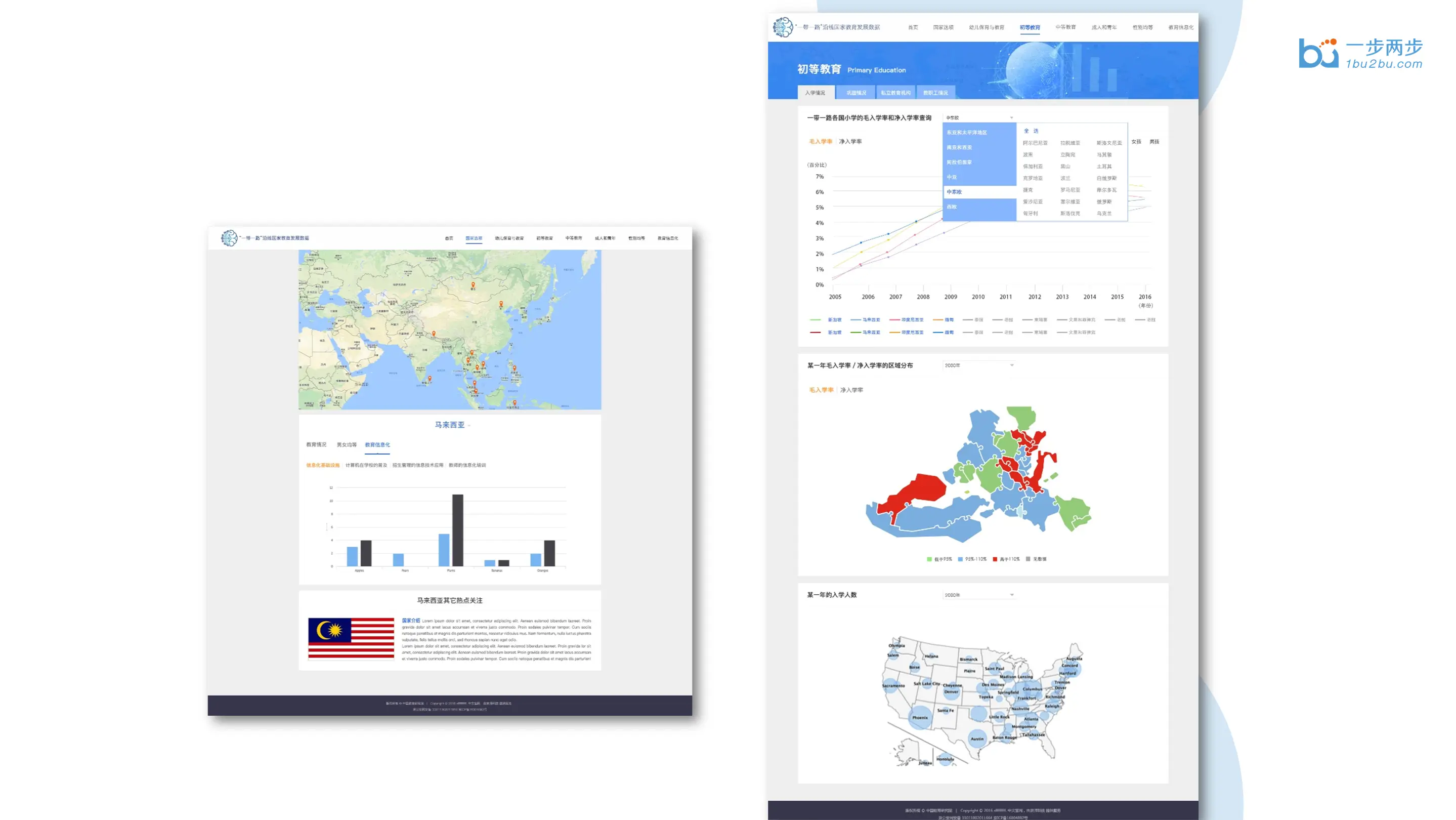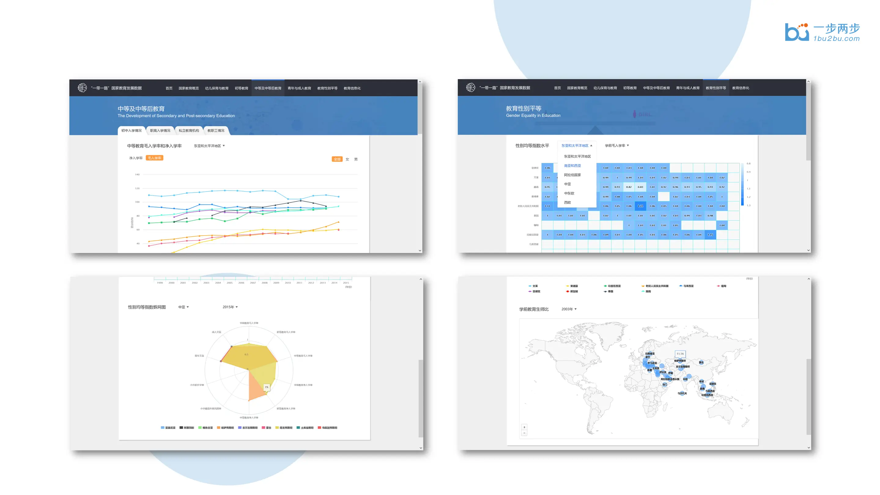 一步两步联合北京师范大学教育系,共同研发了《一带一路教育数据平台》。这个平台是教育信息化的示范项目课题,目的是向政府相关职能部门和科研院校提供“一带一路”沿线国家最新的教育数据,包括各国家教育情况概览,幼儿保育与教育,初等教育,中等教育,成人与青年教育。
