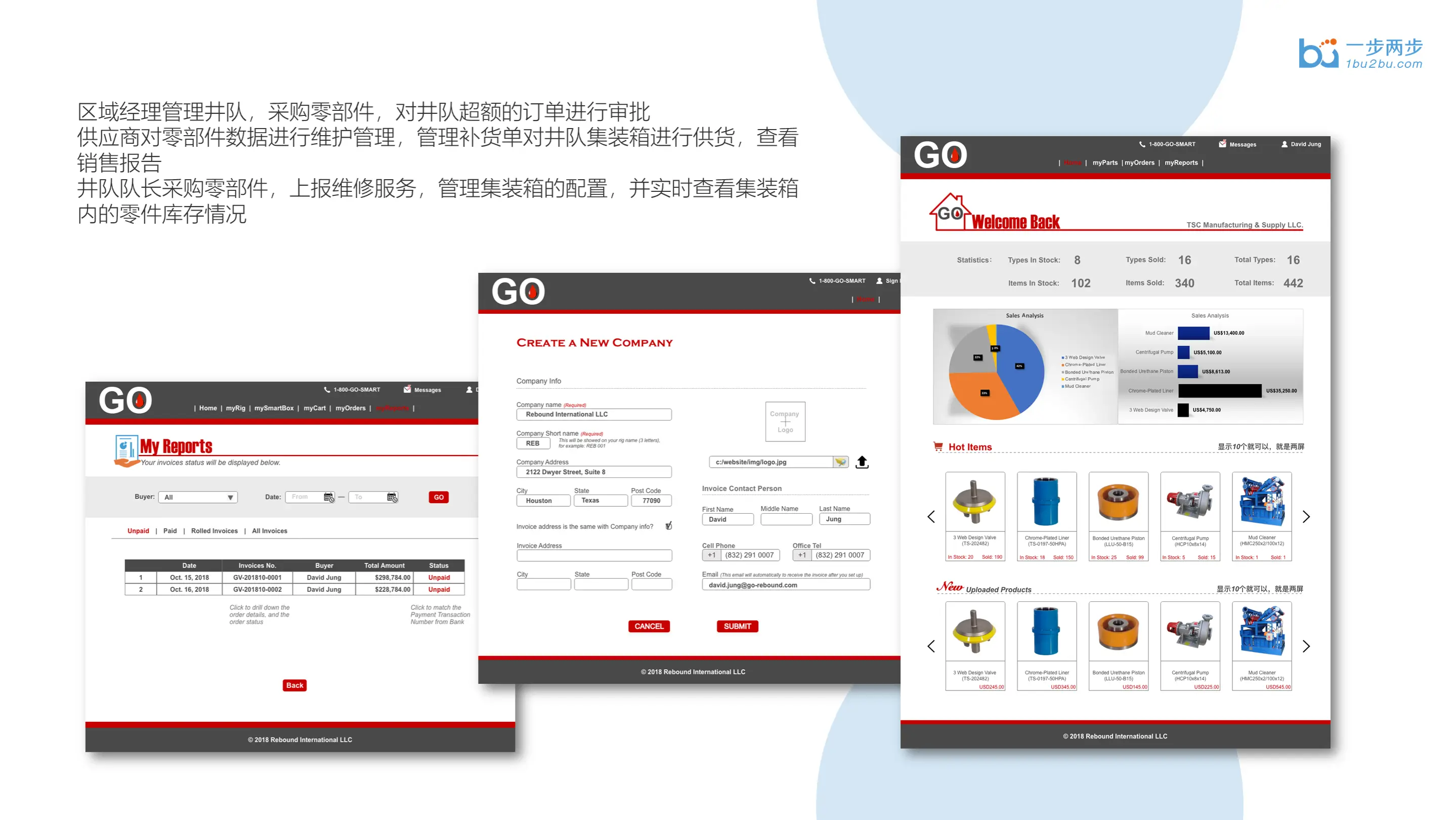 一步两步为客户开发的GO平台,又名Smartbox,是一款定制化的在线钻井作业系统,该系统集成了在线零部件/消耗品管理、大数据驱动预防性维护和24/7维修服务选项。