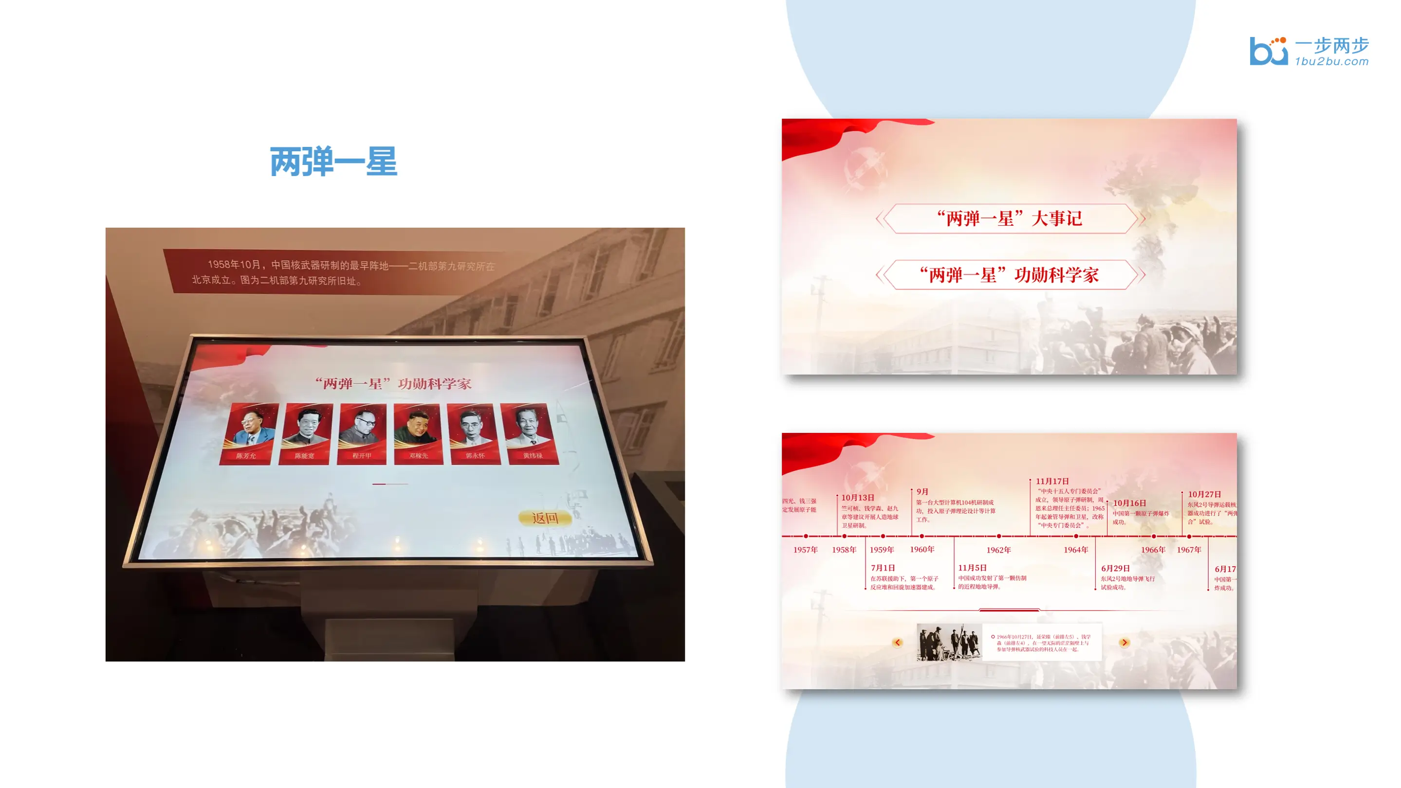 3、两弹一星大事记与功勋科学家多媒体互动屏:安卓原生开发,展示两弹一星大事记的时间轴以及相关历史照片,还可以查看二十三位两弹一星功勋科学家的详细介绍。